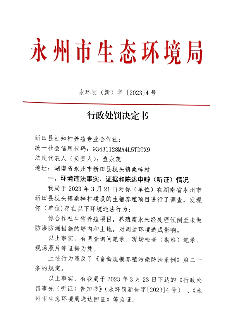 新田县社知种养殖专业合作社合作社生猪养殖项目,养殖废水未经处理倾倒至未做防渗防漏措施的塘内和土地,对周边环境造成影响行政处罚决定书