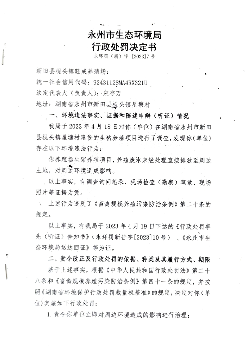 新田县枧头镇旺成养殖场生猪养殖项目,养殖废水未经处理直接排放至周边土地,对周边环境造成影响行政处罚决定书