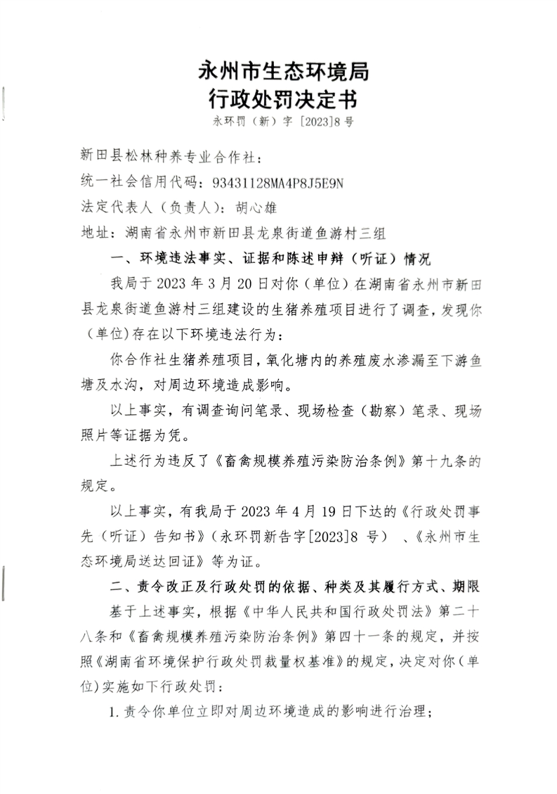 新田县松林种养专业合作社生猪养殖项目,氧化塘内的养殖废水渗漏至下游鱼塘及水沟,对周边环境造成影响行政处罚决定书