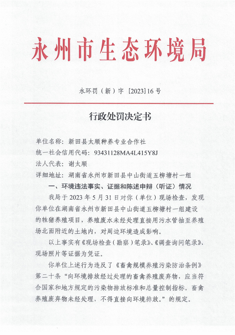 新田县太顺种养专业合作社牲猪养殖项目,养殖废水未经处理直接用污水管抽至养殖场北面附近的土地内,对周边环境造成影响行政处罚决定书