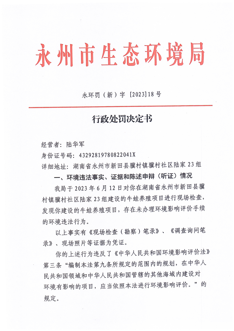 陆华军牛蛙养殖项目,存在未办理环境影响评价手续行政处罚决定书