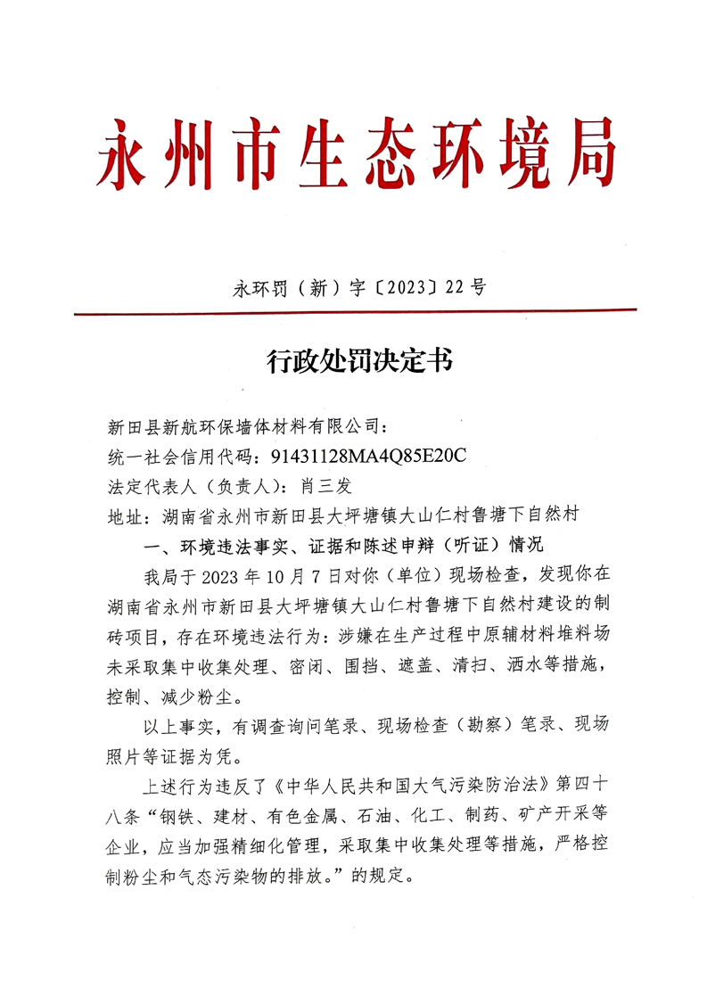 新田县新航环保墙体材料有限公司在生产过程中原辅材料堆料场未采取集中收集处理、密闭、围挡、遮盖、清扫、洒水等措施,控制、减少粉尘行政处罚决定书