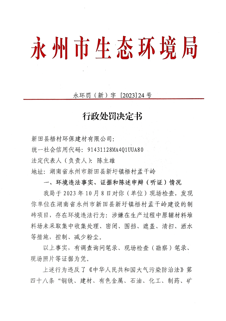 新田县梧村环保建材有限公司在生产过程中原辅材料堆料场未采取集中收集处理、密闭、围挡、遮盖、清扫、洒水等措施,控制、减少粉尘行政处罚决定书