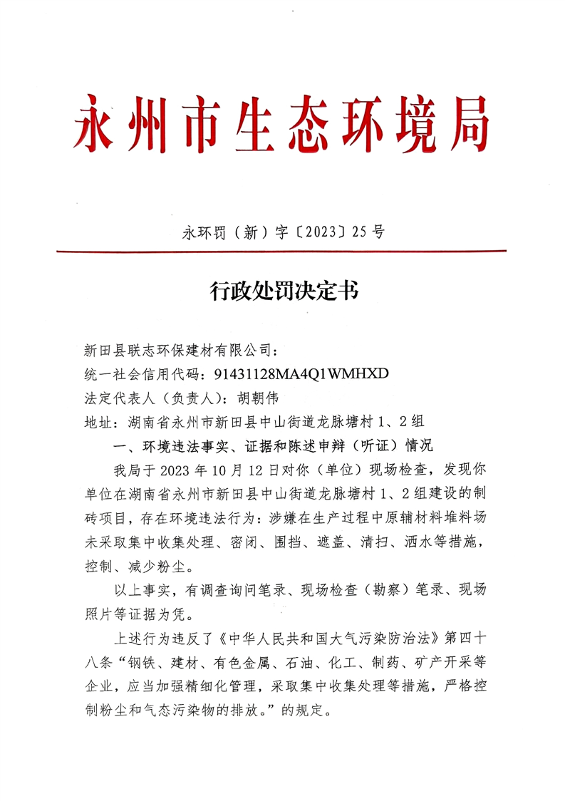 新田县联志环保建材有限公司在生产过程中原辅材料堆料场未采取集中收集处理、密闭、围挡、遮盖、清扫、洒水等措施,控制、减少粉尘行政处罚决定书