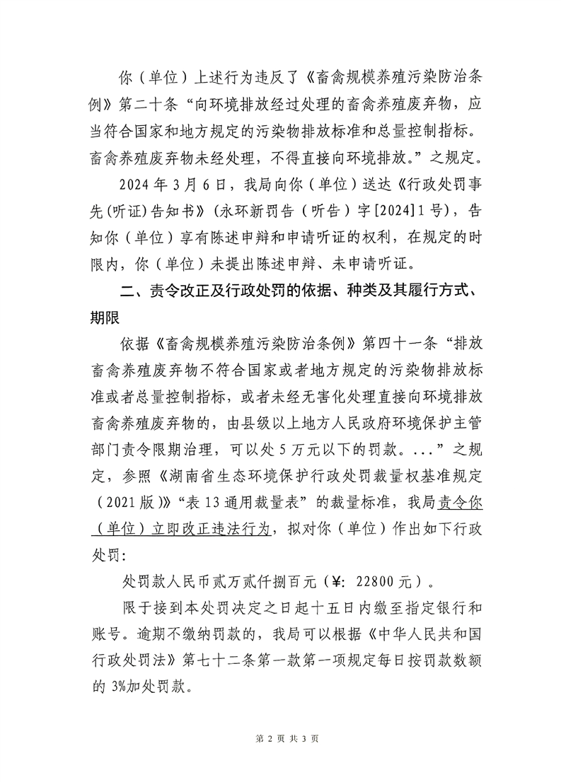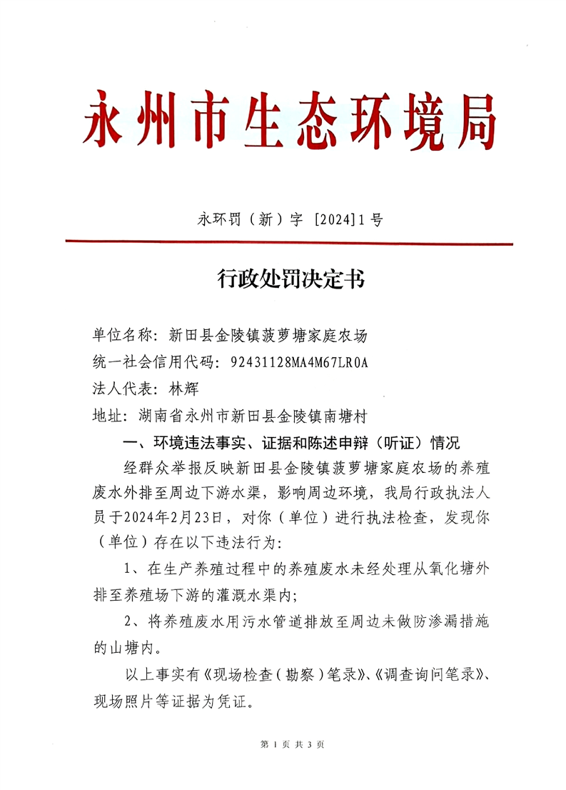 新田县金陵镇菠萝塘家庭农场养殖废水外排至周边下游水渠影响周边环境行政处罚决定书