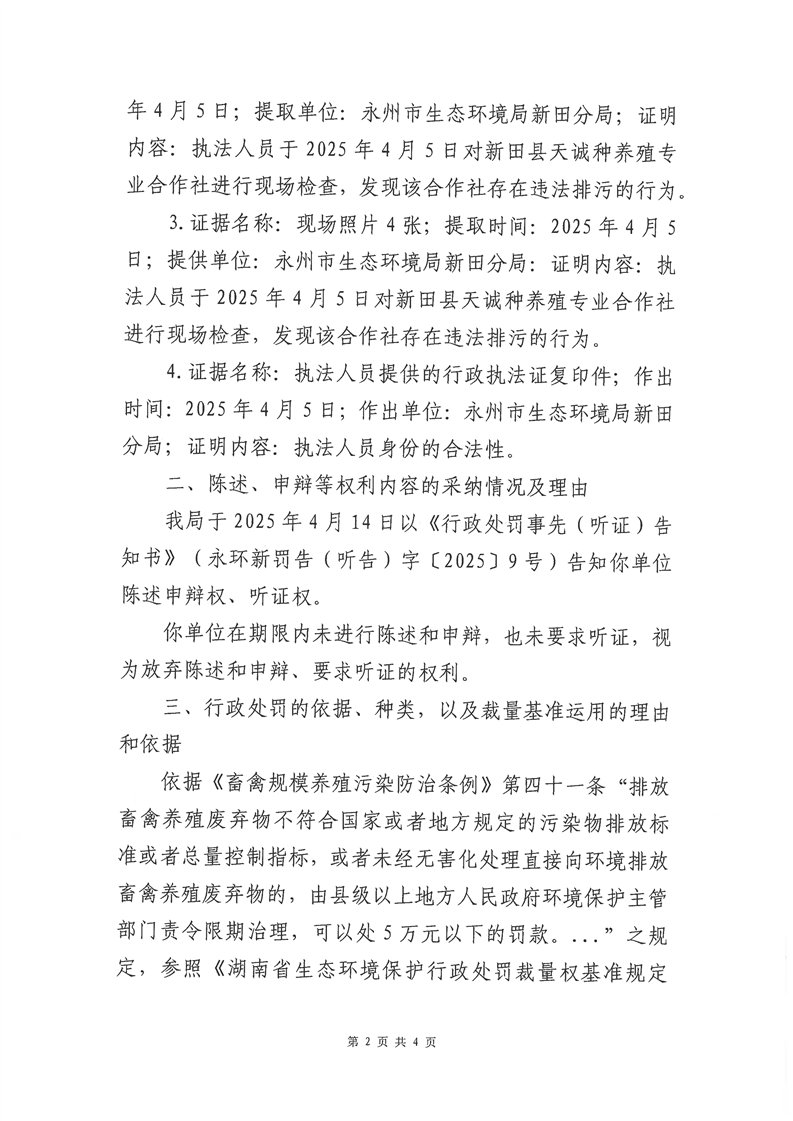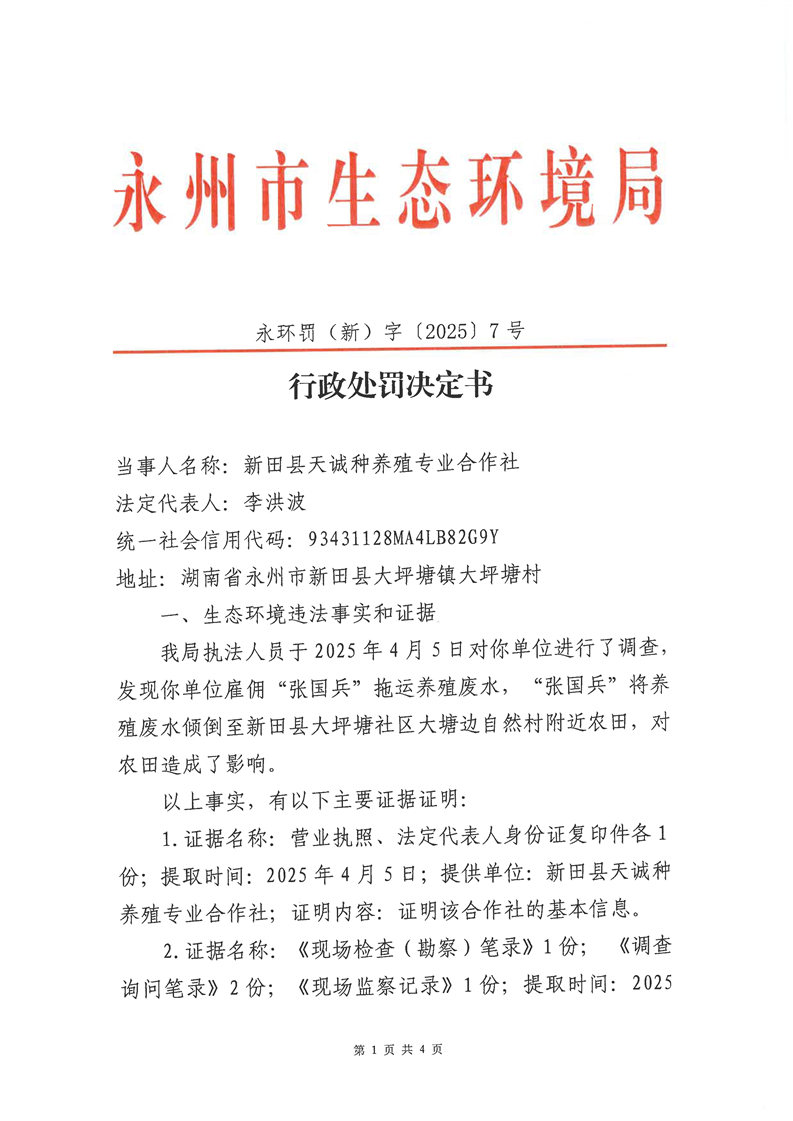 新田县天诚种养殖专业合作社雇佣“张国兵”拖运养殖废水,“张国兵”将养殖废水倾倒至新田县大坪塘社区大塘边自然村附近农田行政处罚决定书