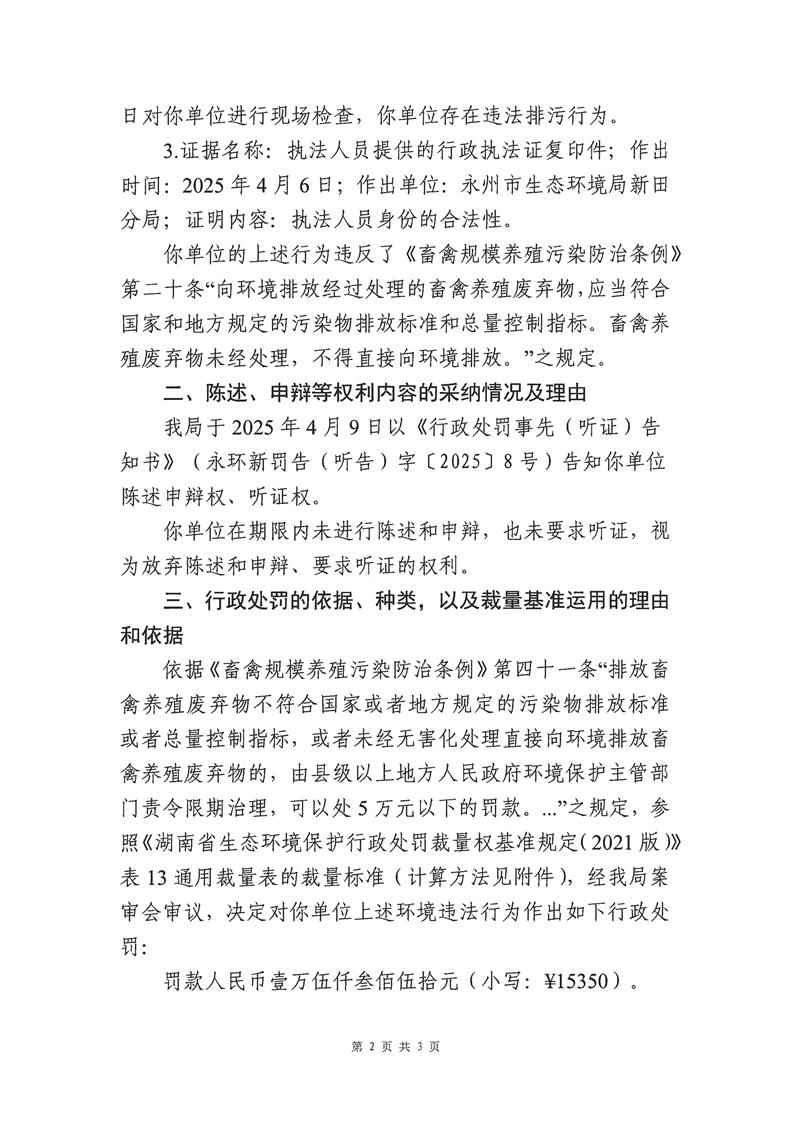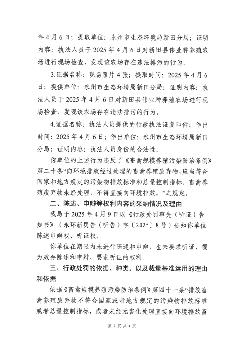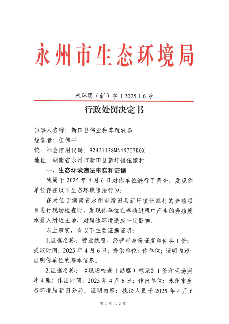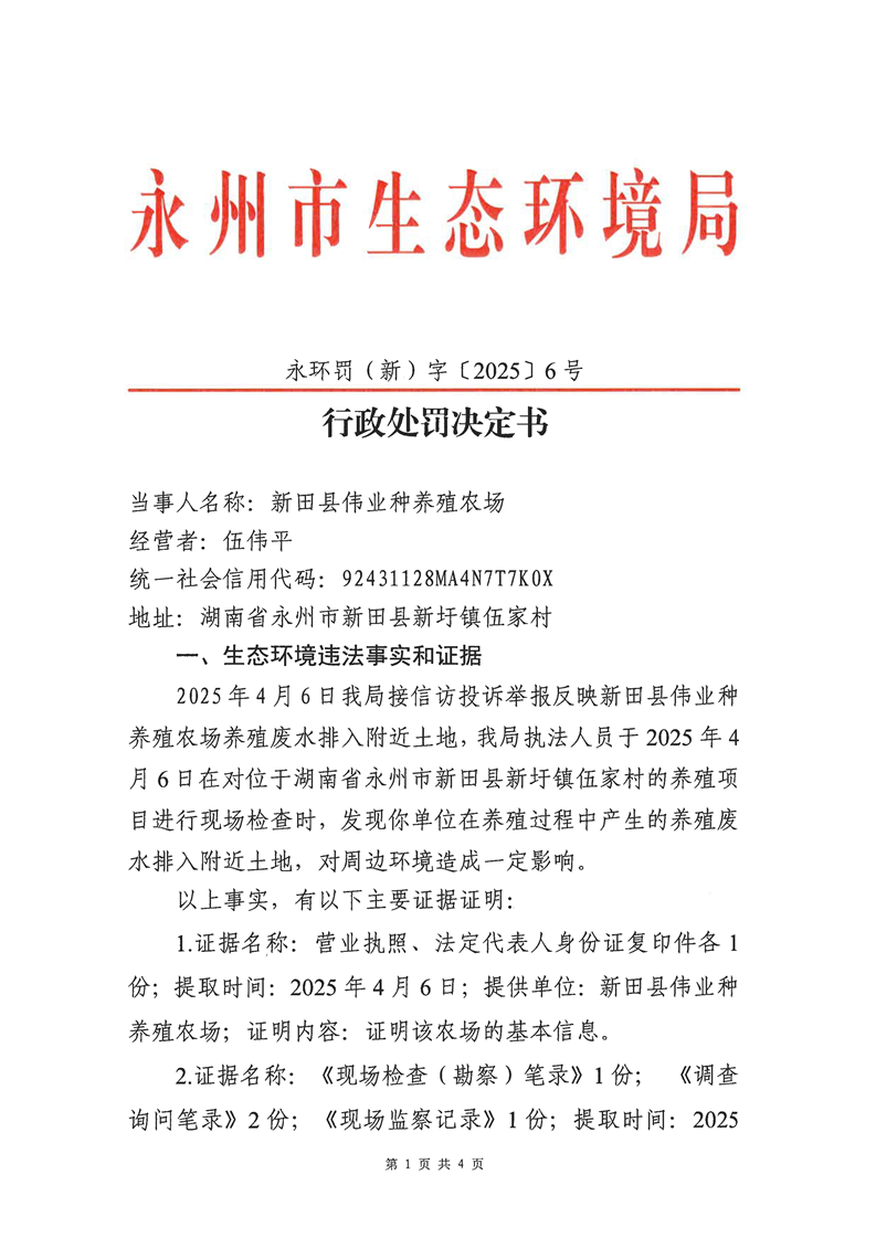 新田县伟业种养殖农场养殖废水排入附近土地行政处罚决定书