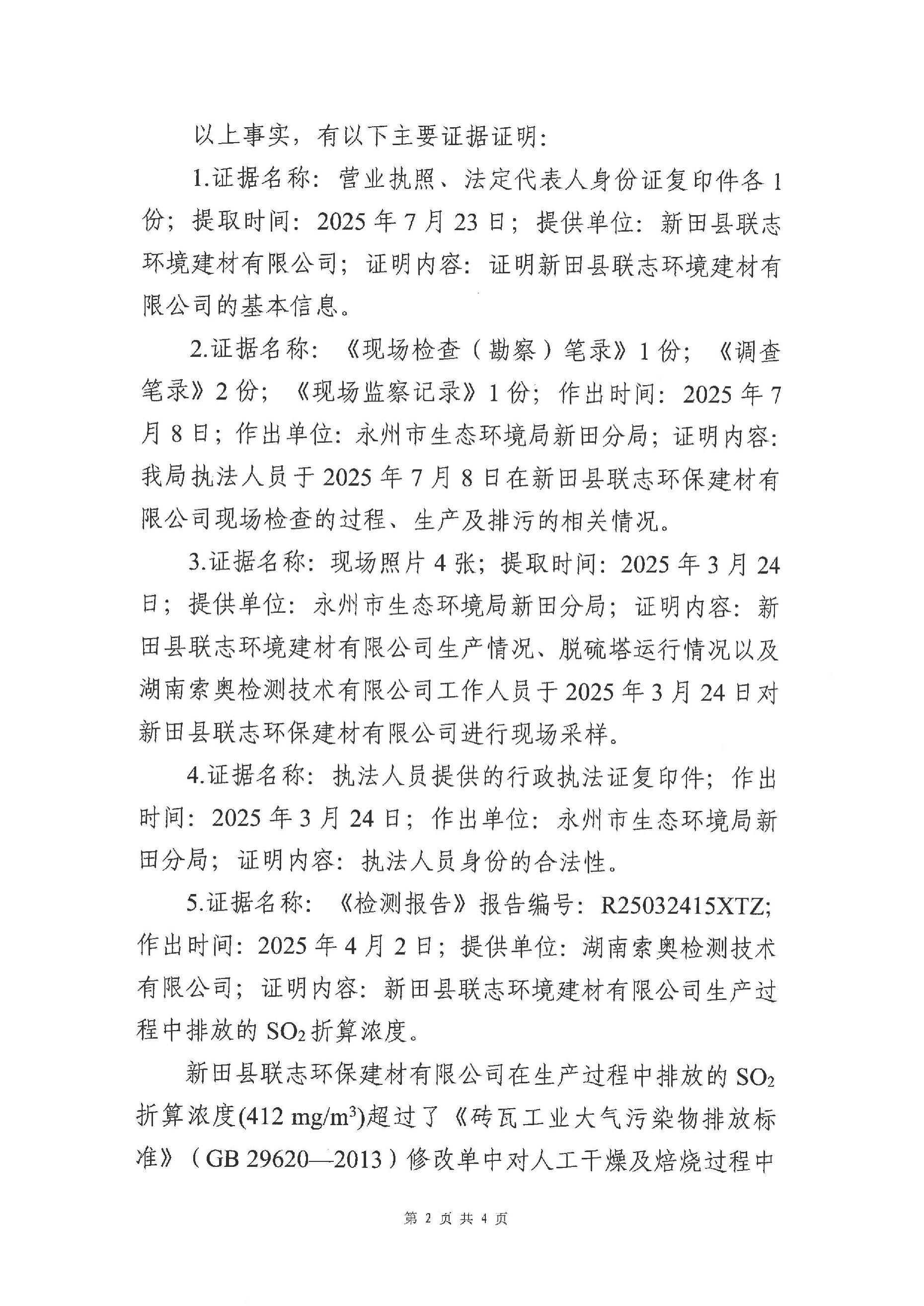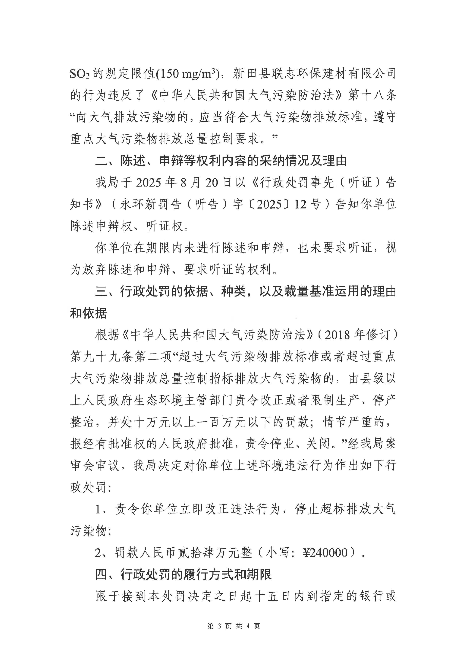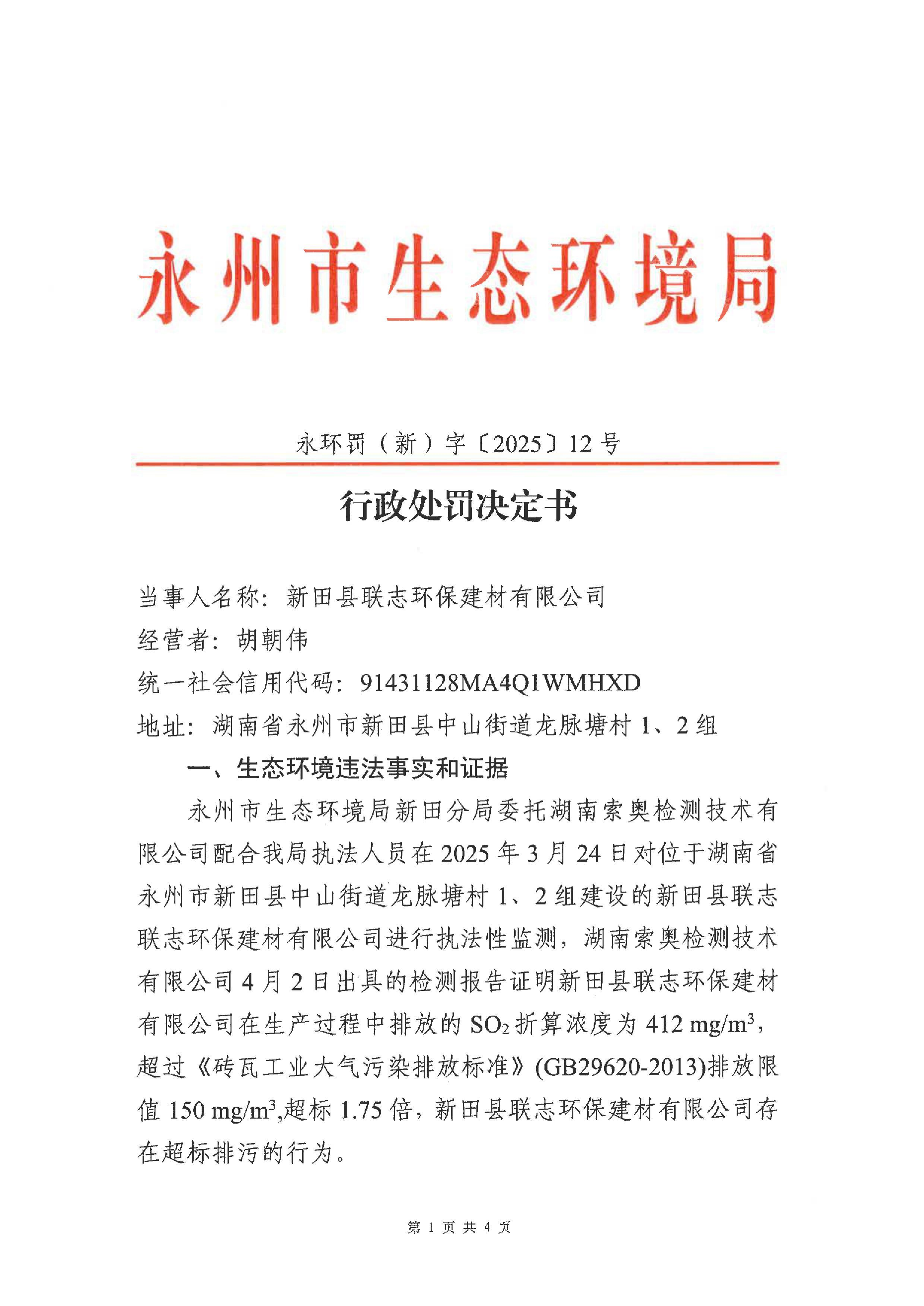 新田县联志环保建材有限公司超标排污行政处罚决定书