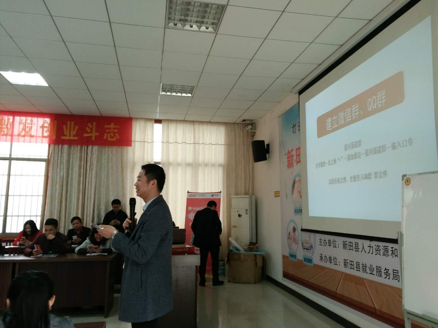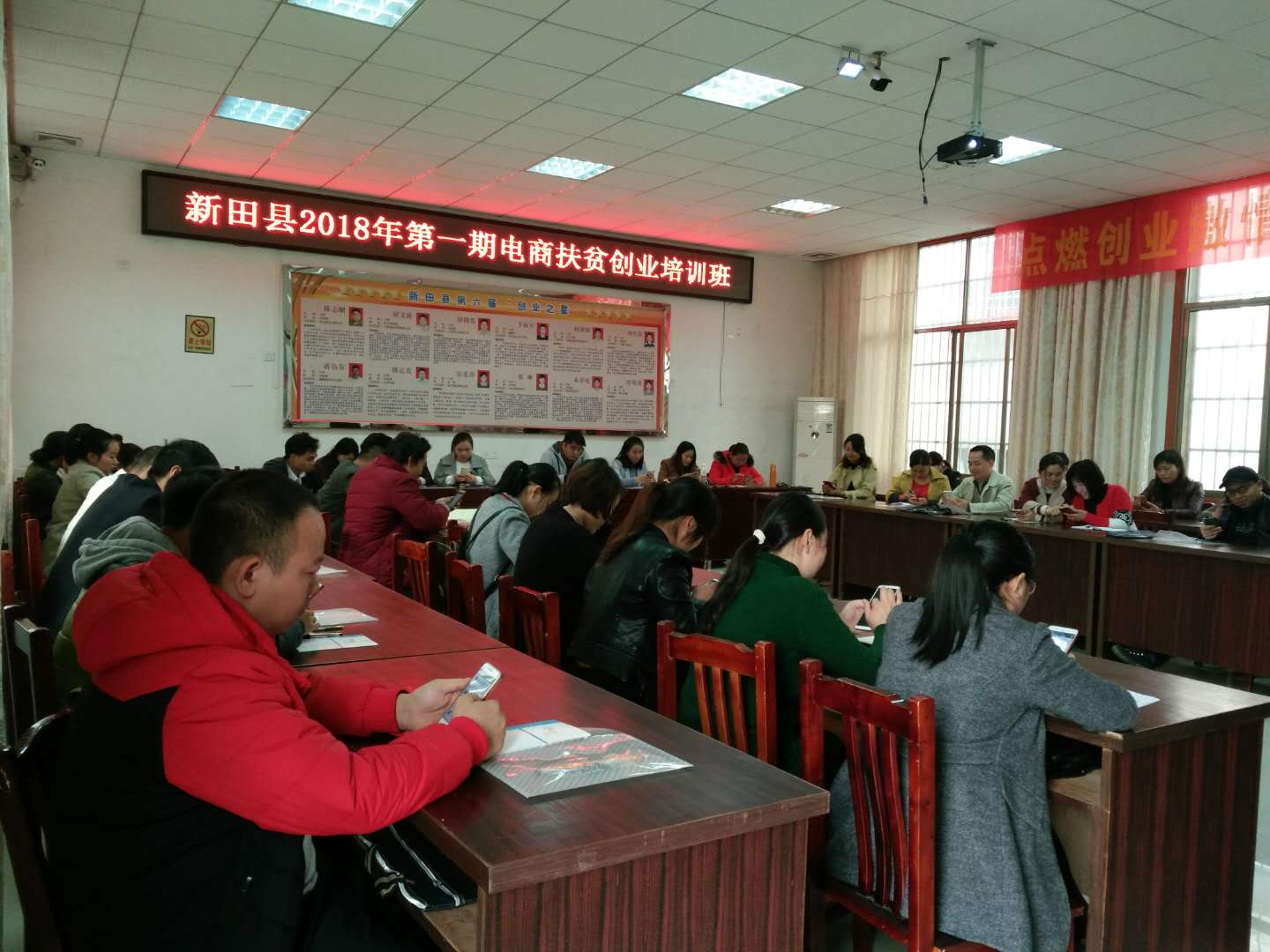 3月14日上午,新田县2018年第一期电商扶贫创业培训班在县就业培训中心顺利开班,42名电商兴趣者参加培训。