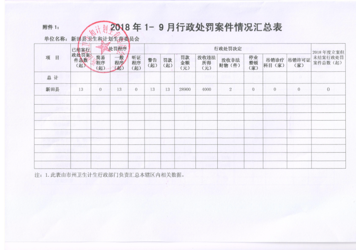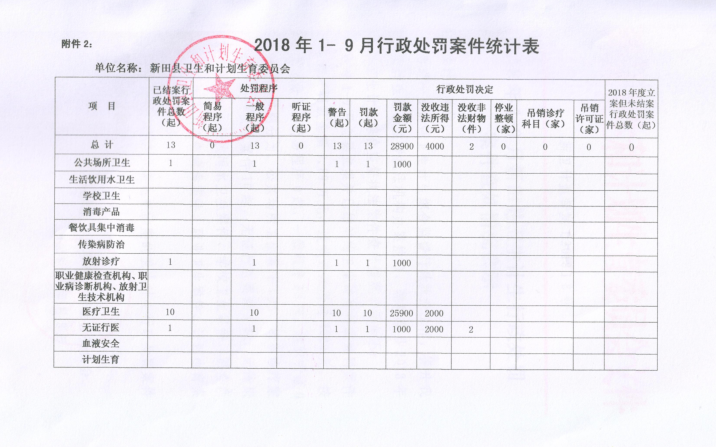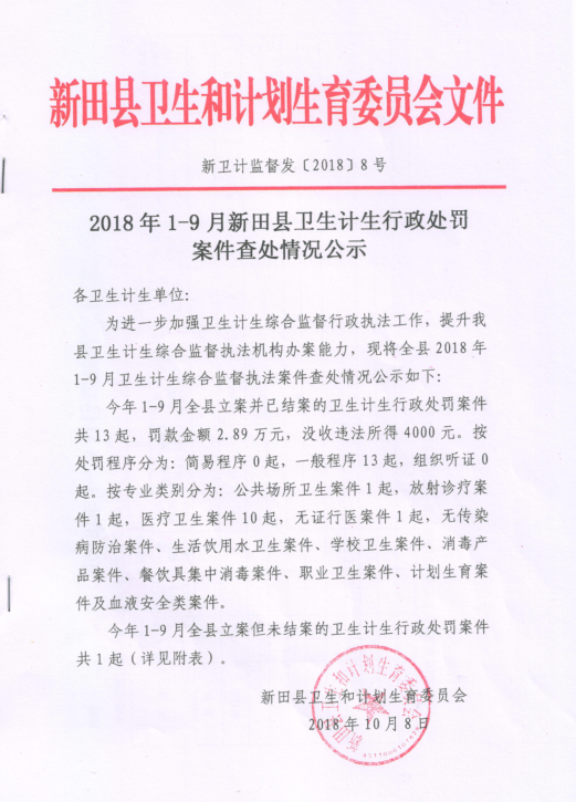 2018年1-9月新田县卫生计生行政处罚案件查处情况公示