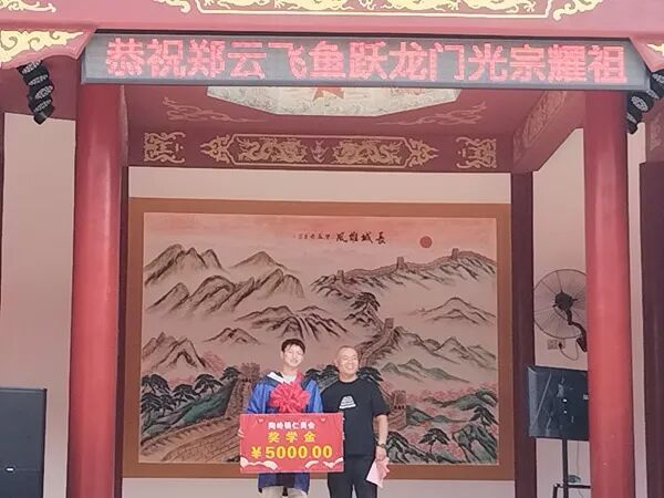 现场洋溢着喜悦与自豪的气氛。郑云飞身着博士礼服,胸佩大红花,村党支部副书记郑知发为郑云飞颁发5000元红色奖学金牌。新田县人民医院驻村工作队队长代表全体工作队员也送上了激励红包与诚挚祝福,并表示:“乡村振兴既要塑形也要铸魂,仁岗村始终把教育放在重要位置,设立专项基金奖励优秀学子,就是希望激励更多孩子用知识改变命运,将来反哺家乡、报效祖国。”