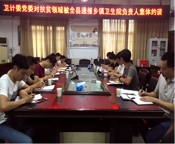 6月11日下午,新田县卫计委党委对田家分院、枧头镇中心卫生院、枧头分院、大坪塘镇卫生院、大坪塘分院、新隆镇卫生院、陶岭卫生院等7家单位的主要负责人就脱贫攻坚工作进行了集体约谈。