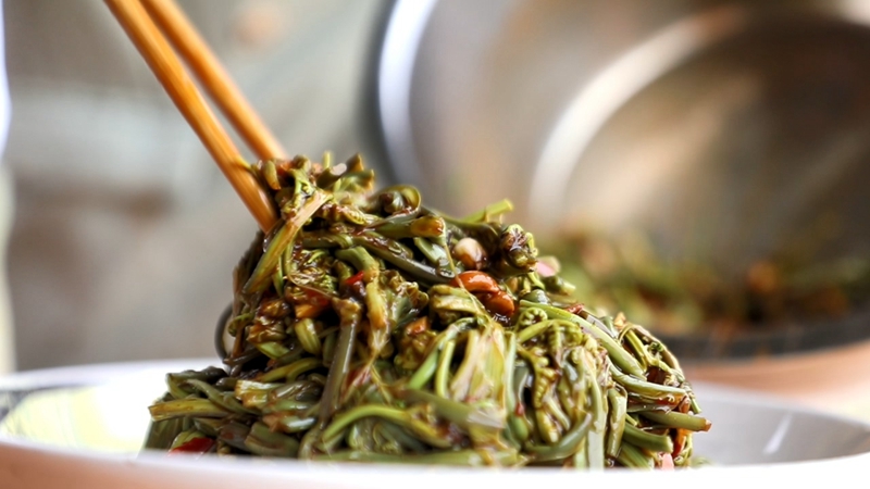 采摘回来的新鲜蕨菜,经过清洗、焯水、浸泡等处理过程后,可清炒,也可凉拌。清炒前,将蕨菜切成小段,热锅烧油,然后放入锅中,适当加上大蒜、辣椒等食材,一起翻炒,出锅的蕨菜口感十分爽脆;凉拌蕨菜则先要将浸泡的蕨菜杆对半撕开,盛放在盆里,撒上食盐,然后淋上适量的辣椒油、生抽、蚝油、豆豉等佐料拌匀即可,味道咸鲜滑润。刚出锅的蕨菜端上桌,和鱼、肉等“硬菜”相比,或许有点“黯然失色”,却总能让食客“欲罢不能”。