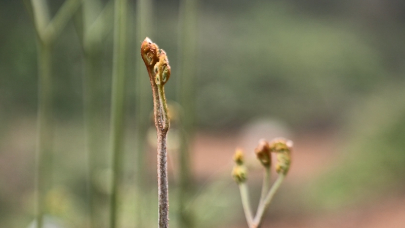 “如果长成叶子的蕨我们就不会去采了,因为不能食用了。颜色比较深,只冒出一点点芽的蕨就比较嫩,我们就会把它采摘下来。”从小在农村长大的郑亚灵,对蕨菜非常熟悉。她介绍,蕨菜七八寸高、筷子般粗,表面有纤细的白色绒毛,才是“极品”