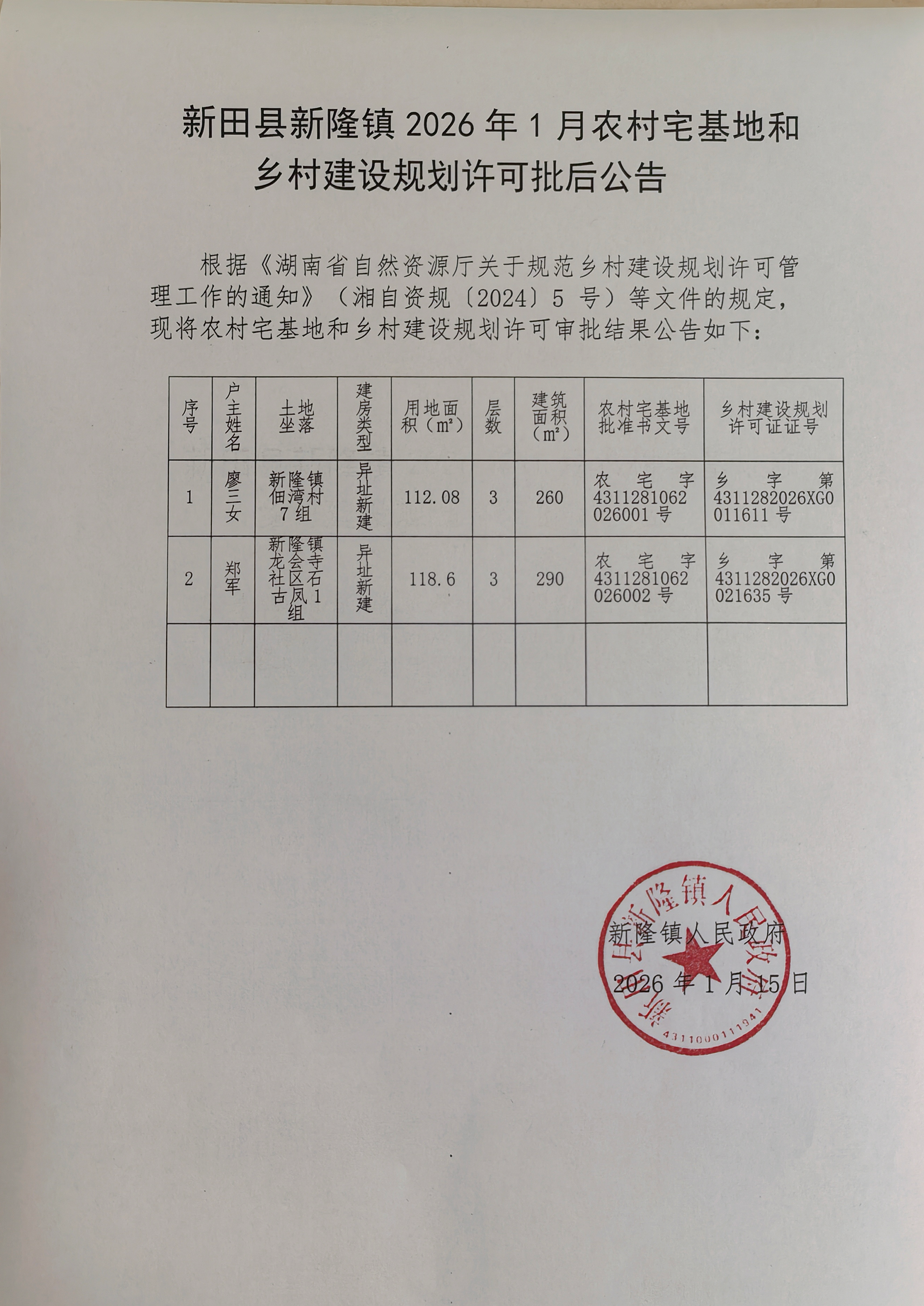 新田县新隆镇2026年1月农村宅基地和乡村建设规划许可批后公告