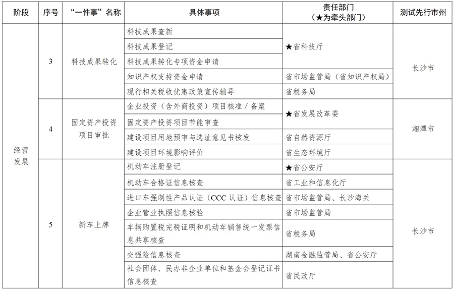 3.上线试运行。各事项牵头单位组织搭建办事模块、开展系统对接和应用场景开发,采取“技术总支撑+小分队”方式,推进“一件事”上线。由省政务服务和大数据中心、数字湖南公司提供“技术总支撑”,各事项牵头单位联合配合单位及试点市州组建技术“小分队”联合攻坚,推进上线省“一网通办”系统和“湘易办”APP“高效办成一件事”专区。(牵头单位:各事项牵头单位,责任单位:省数据局、省政务服务和大数据中心、各配合单位;完成时间:2025年4月底前)