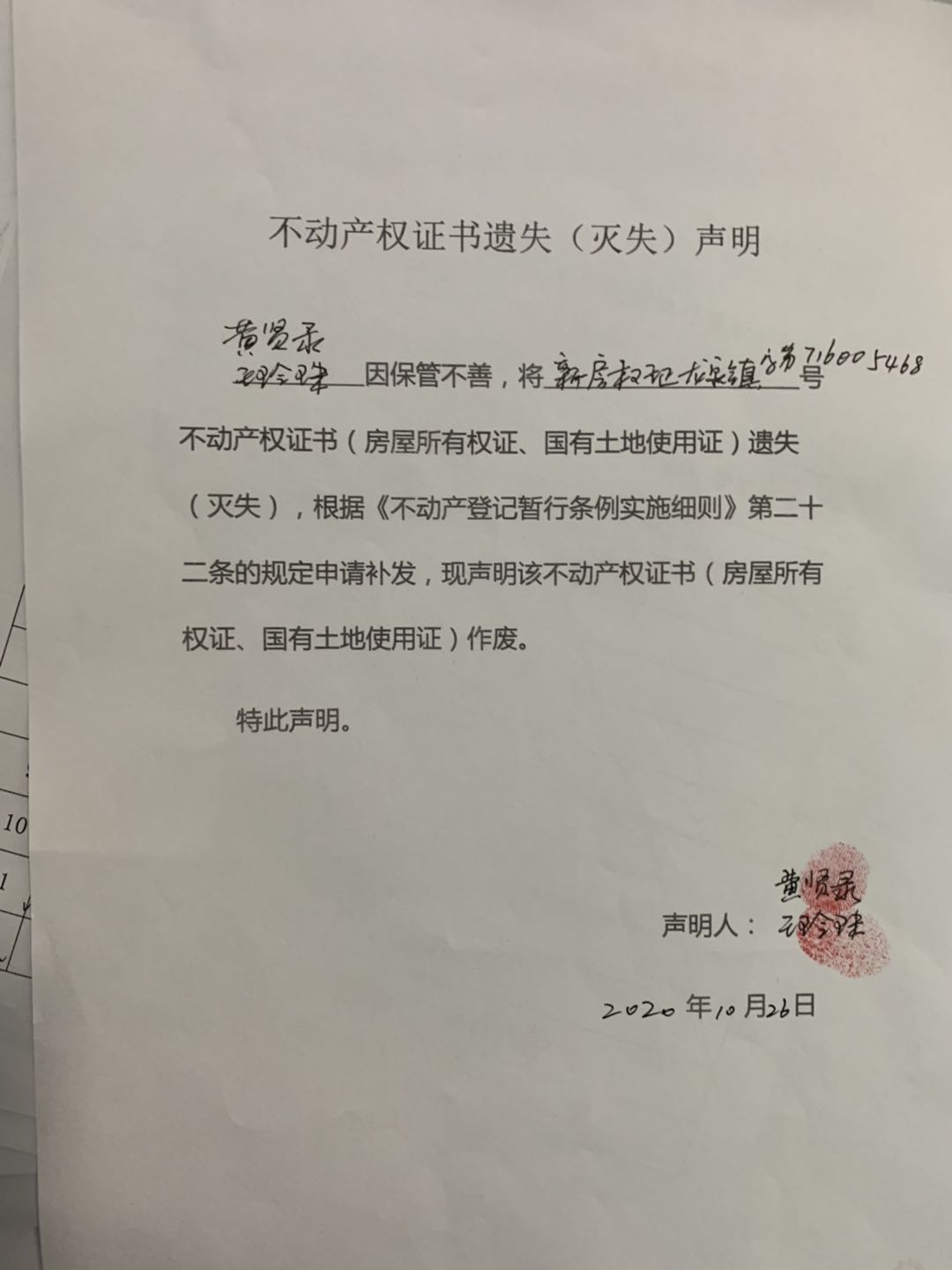 不动产权证书遗失声明(灭失)(黄贤录、王玲珠)