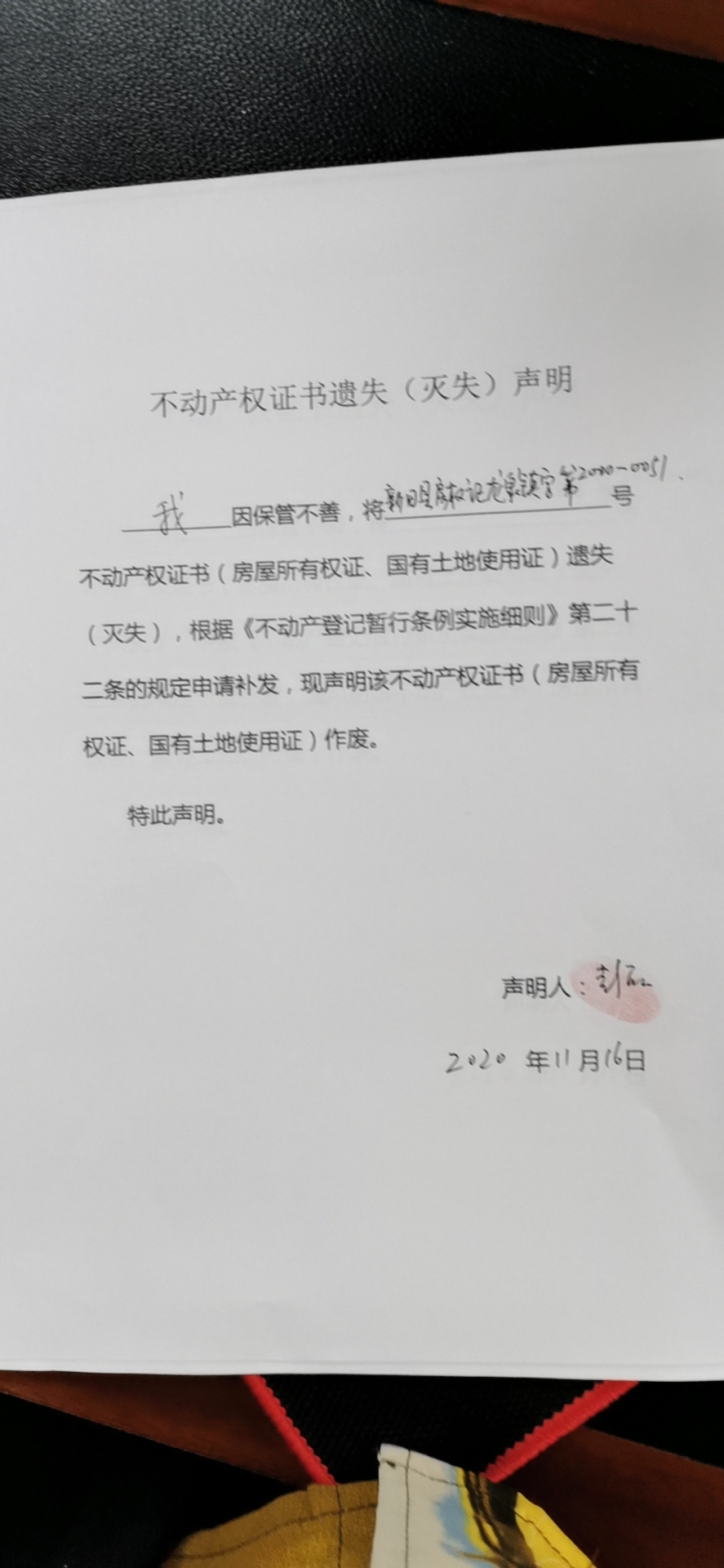 不动产权证书遗失声明(灭失)(彭丽)