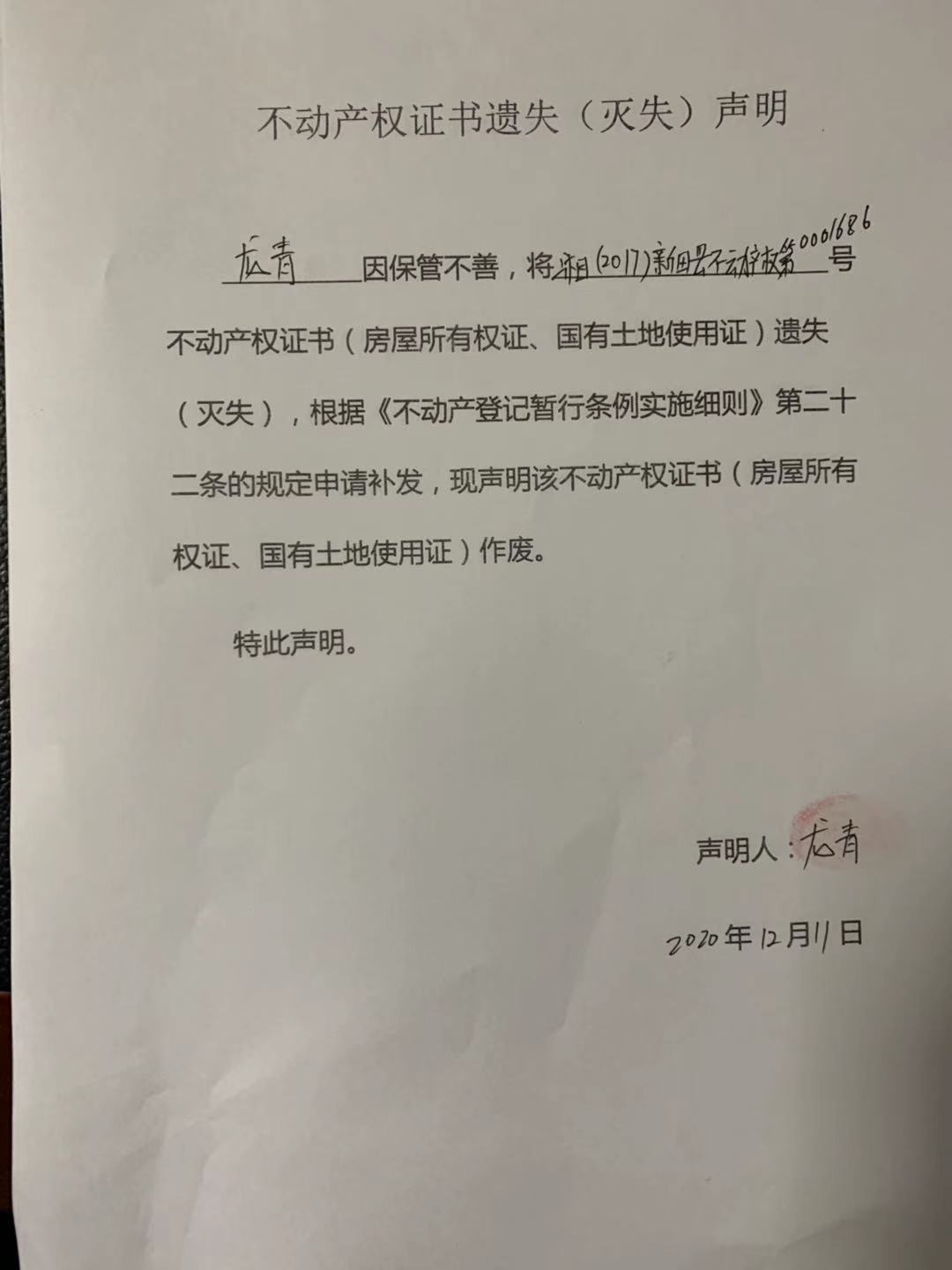 不动产权证书遗失声明(灭失)(龙青)1686号