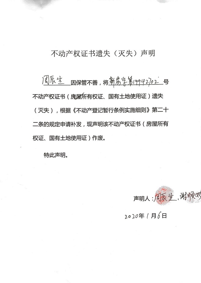 不动产权证书遗失声明(灭失)(周辰生 谢顺姣)