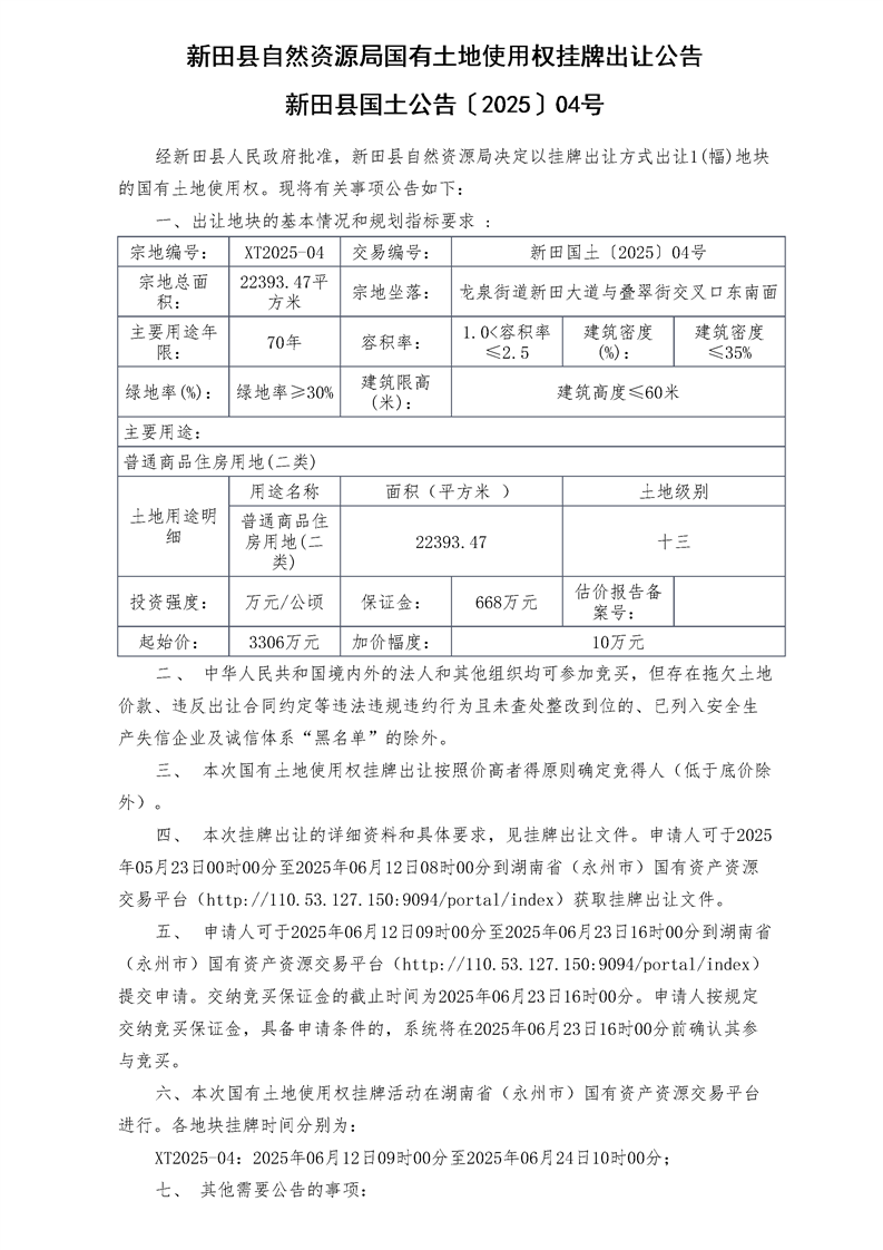 新田县自然资源局国有土地使用权挂牌出让公告新田县国土公告〔2025〕04号