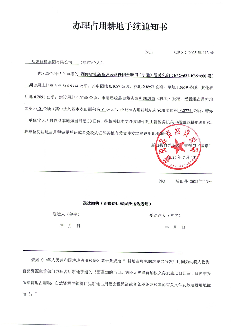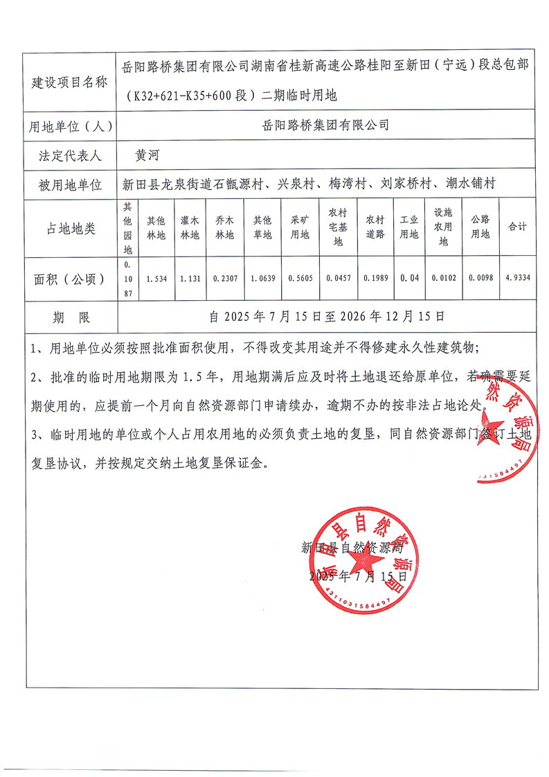 岳阳路桥集团有限公司湖南省桂新高速公路桂阳至新田(宁远)段总包部(K32+621-K35+600段)二期临时用地批复公示