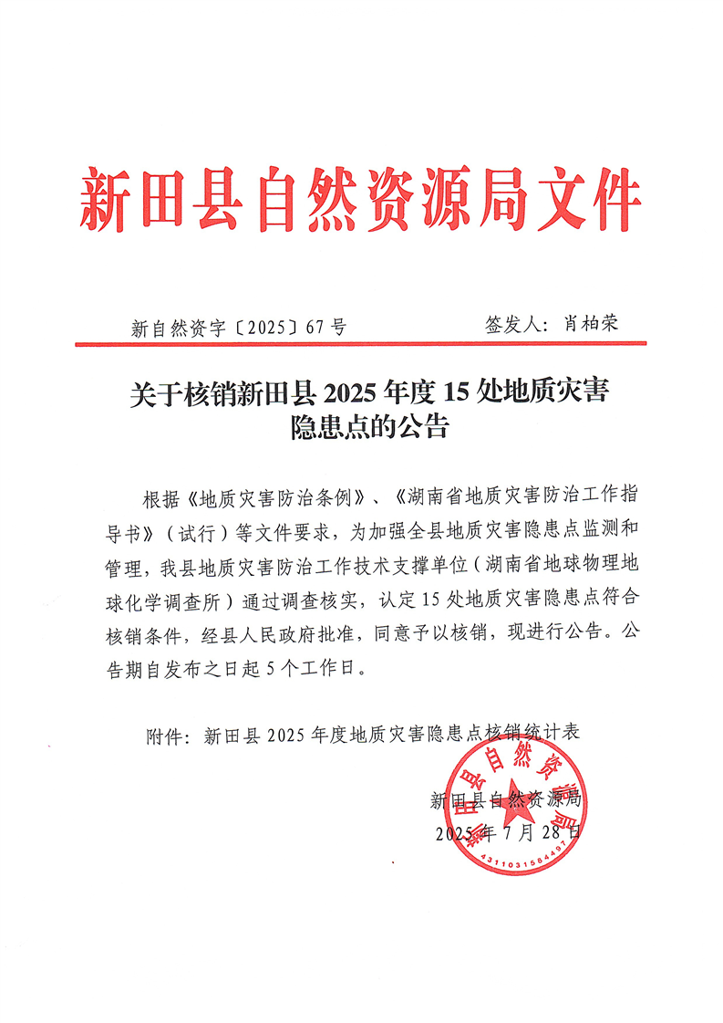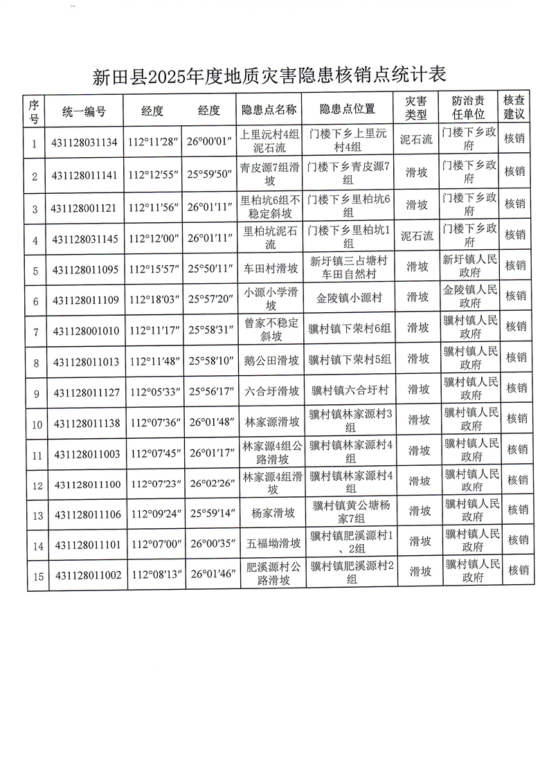 关于核销新田县2025年度15处地质灾害隐患点的公告