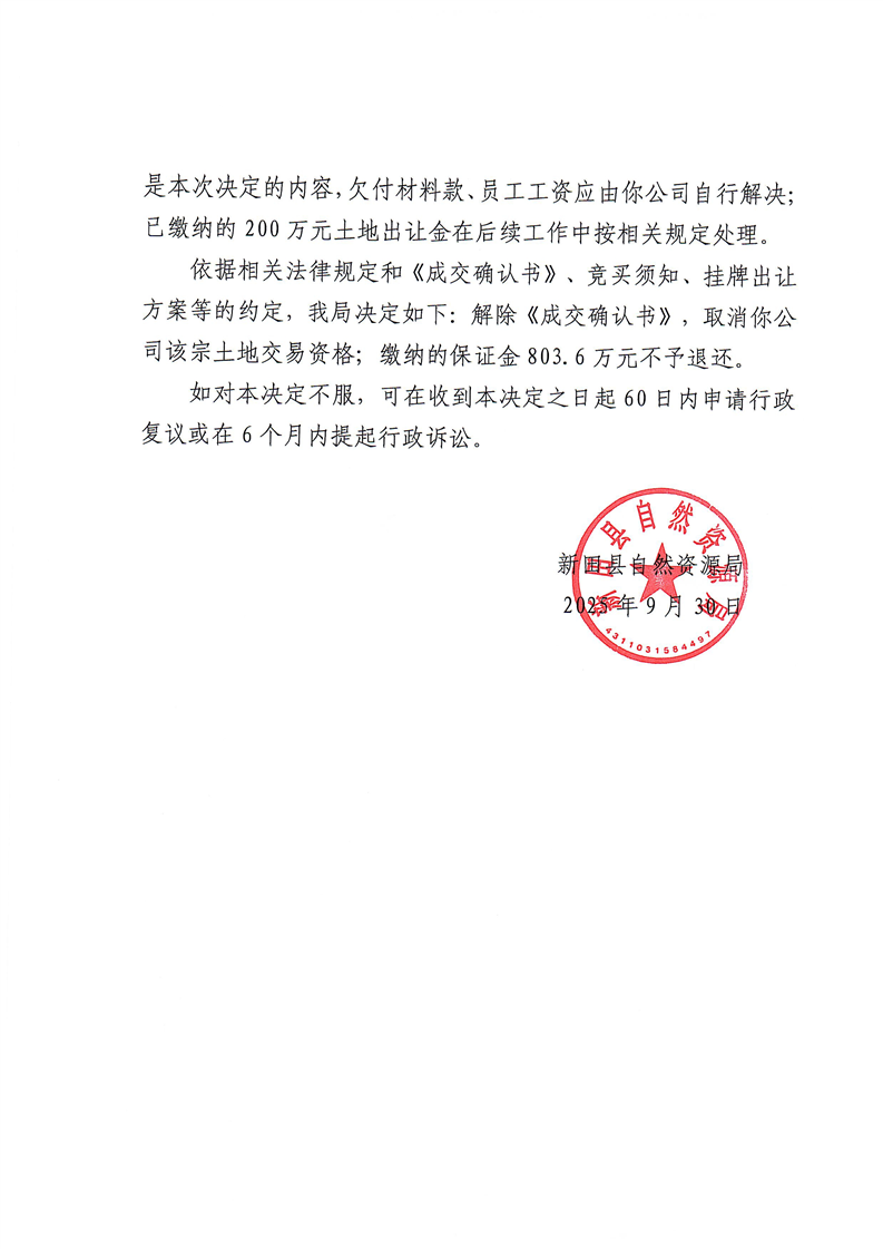 解除土地交易决定书(湖南茂顺房地产有限公司)