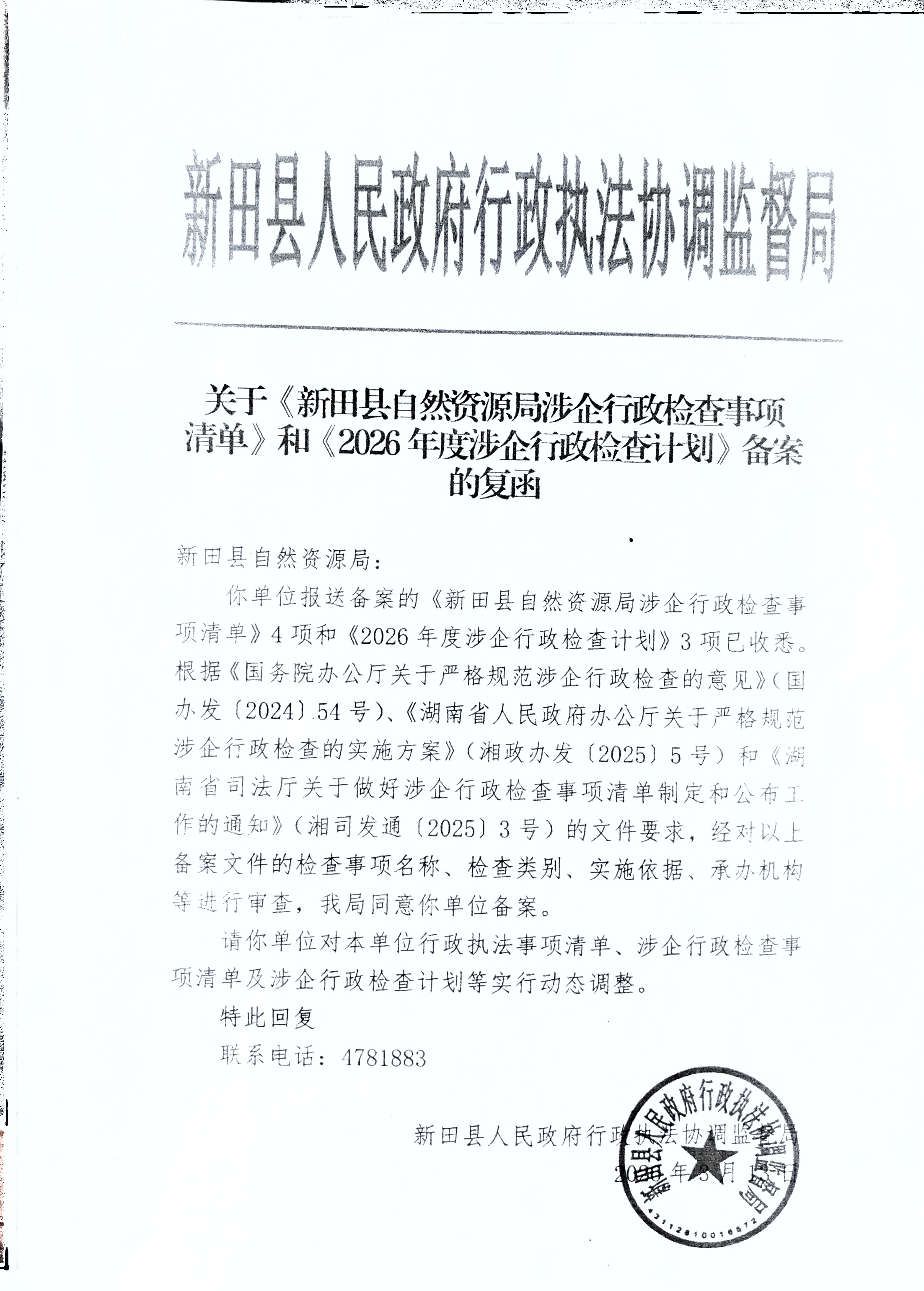 关于同意我局2026年度涉企行政检查计划和涉企行政检查事项清单的复函