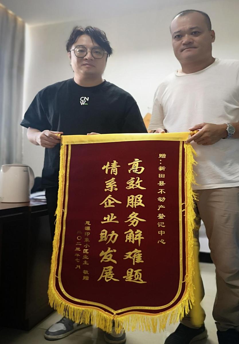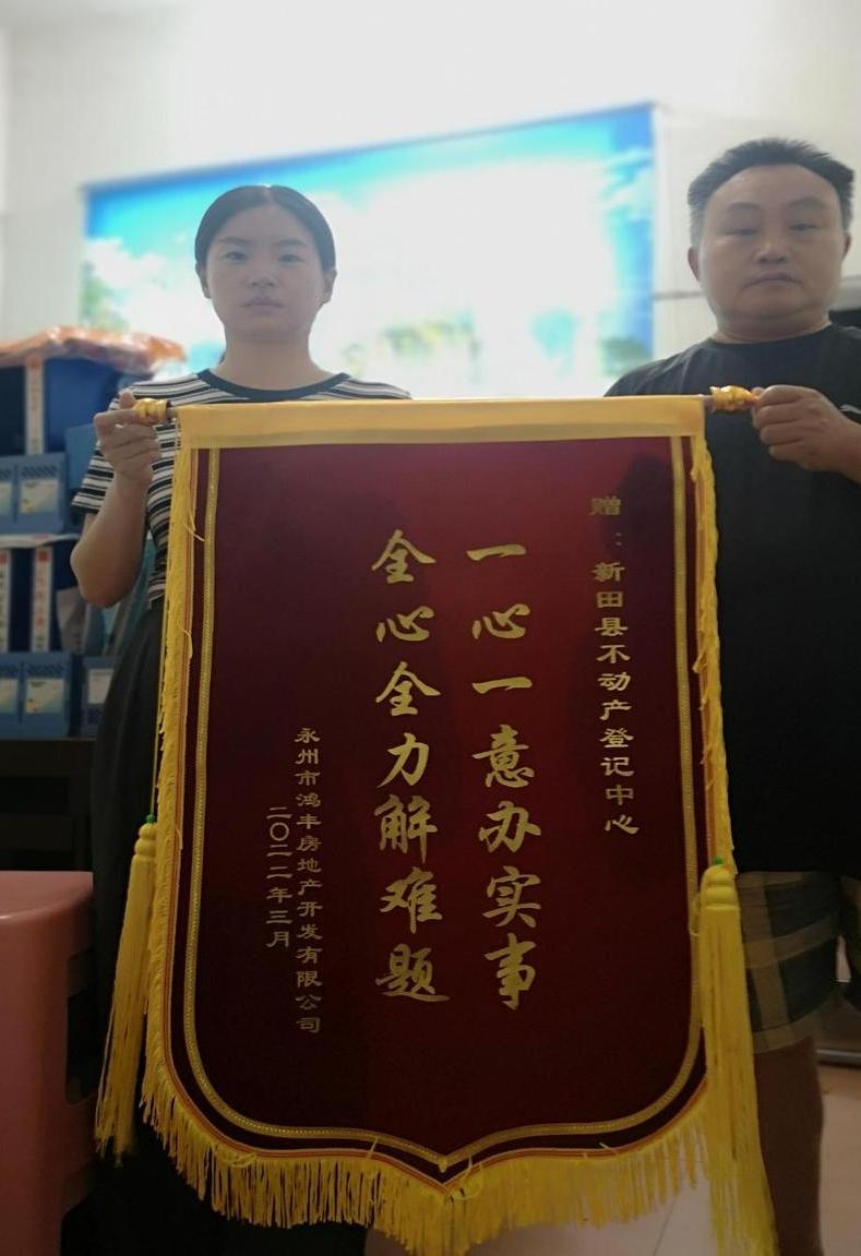 “八年等待终圆梦,房产证到手心欢畅!”“一心一意办实事,全心全力解难题!”今天,新田县汇金名都小区的代表,把鲜红的锦旗送到新田县自然资源局不动产登记中心,表达感激之情。近日,103户业主在期盼中迎来了他们的不动产权证。