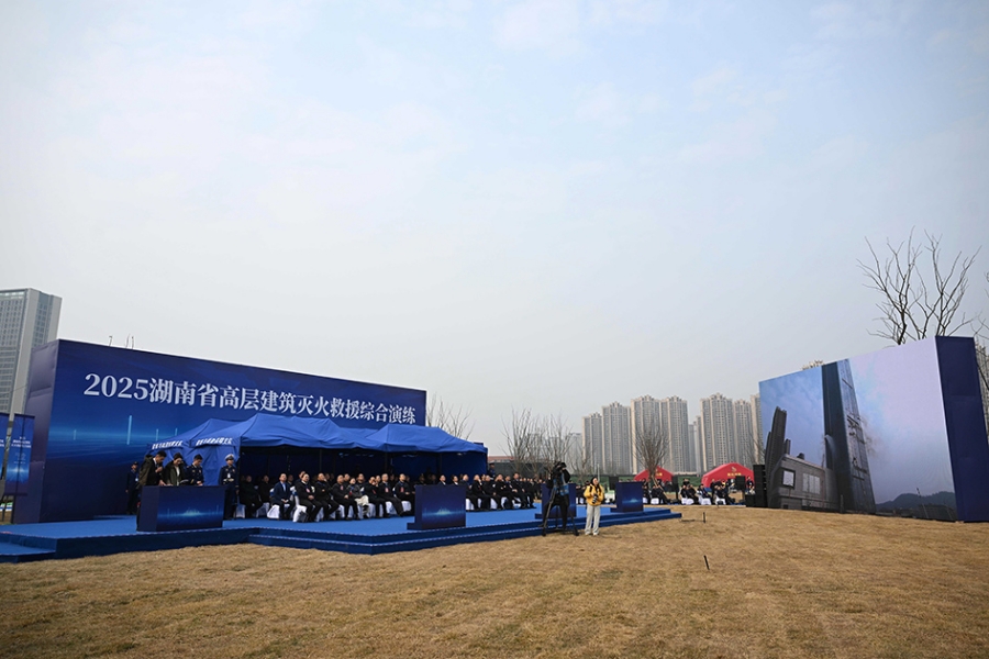 演练模拟一栋高层建筑南楼第15层电缆井起火并引燃周边可燃物,火势迅速蔓延,造成15至22层楼起火,紧急疏散近千人后,仍有数十人被困。同时因风势形成飞火,引燃正在施工的北楼外墙保温材料,形成立体燃烧。演练分为事故单位响应、长沙市级响应、省级响应3个阶段,涵盖事故单位初期处置、等级响应升级、现场指挥部搭建、无人机侦察、人员搜救和火灾扑救、直升机空中转运伤员、新闻发布等环节,全流程、全要素模拟高层建筑火灾应对处置工作。