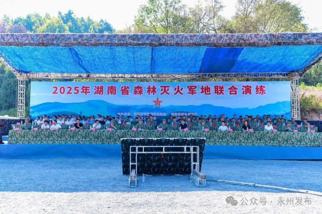 10月10日,2025年湖南省森林灭火军地联合演练在永州祁阳举行。省军区司令员林佳春出席并讲话,市委书记朱洪武致辞。