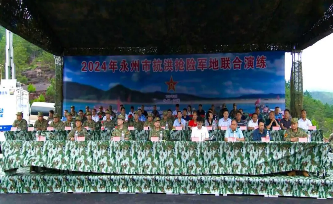 5月30日下午,在永州市宁远县凤仙桥水库,来自全市的7支基干民兵队伍,消防、水利、气象等单位和社会救援力量共200余人,迅速完成动员集结、人装出动和救援作业,一场计划周密、贴近实战的军地联合防汛综合应急演练正式拉开序幕。永州市委常委、军分区政治委员张嘉庆出席活动并讲话,相关单位军地领导到场观摩。