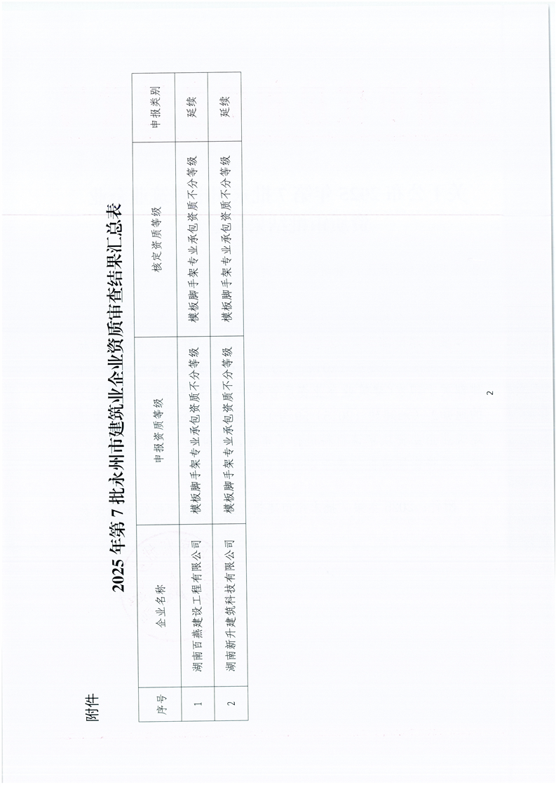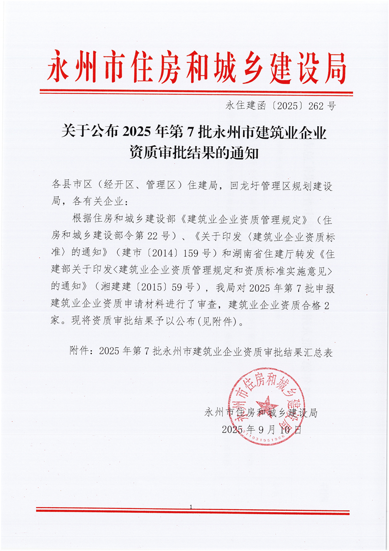 关于公布2025年第7批永州市建筑业企业资质审批结果的通知
