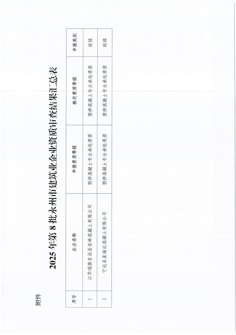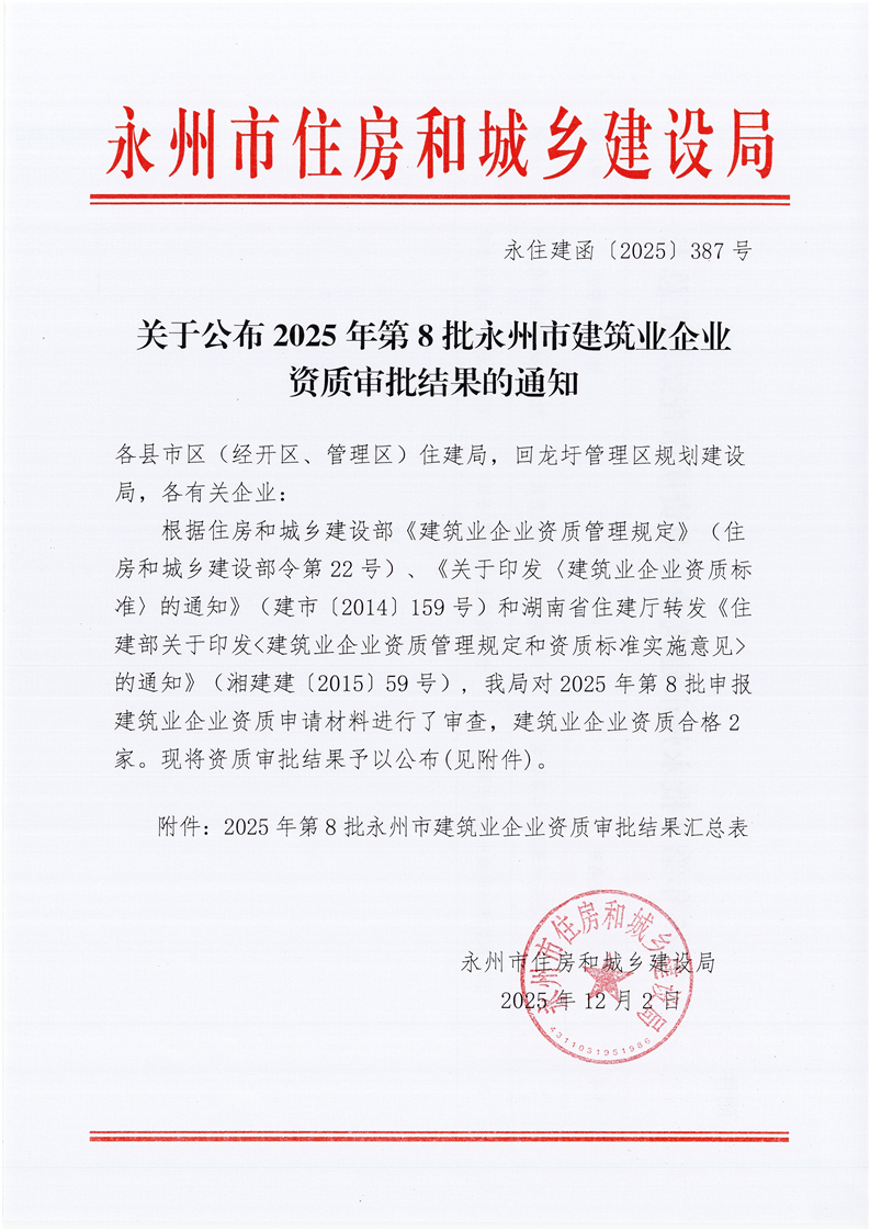 关于公布2025年第8批永州市建筑业企业资质审批结果的通知