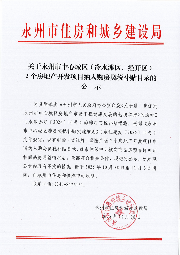 关于永州市中心城区(冷水滩区、经开区)2个房地产开发项目纳入购房契税补贴目录的公示