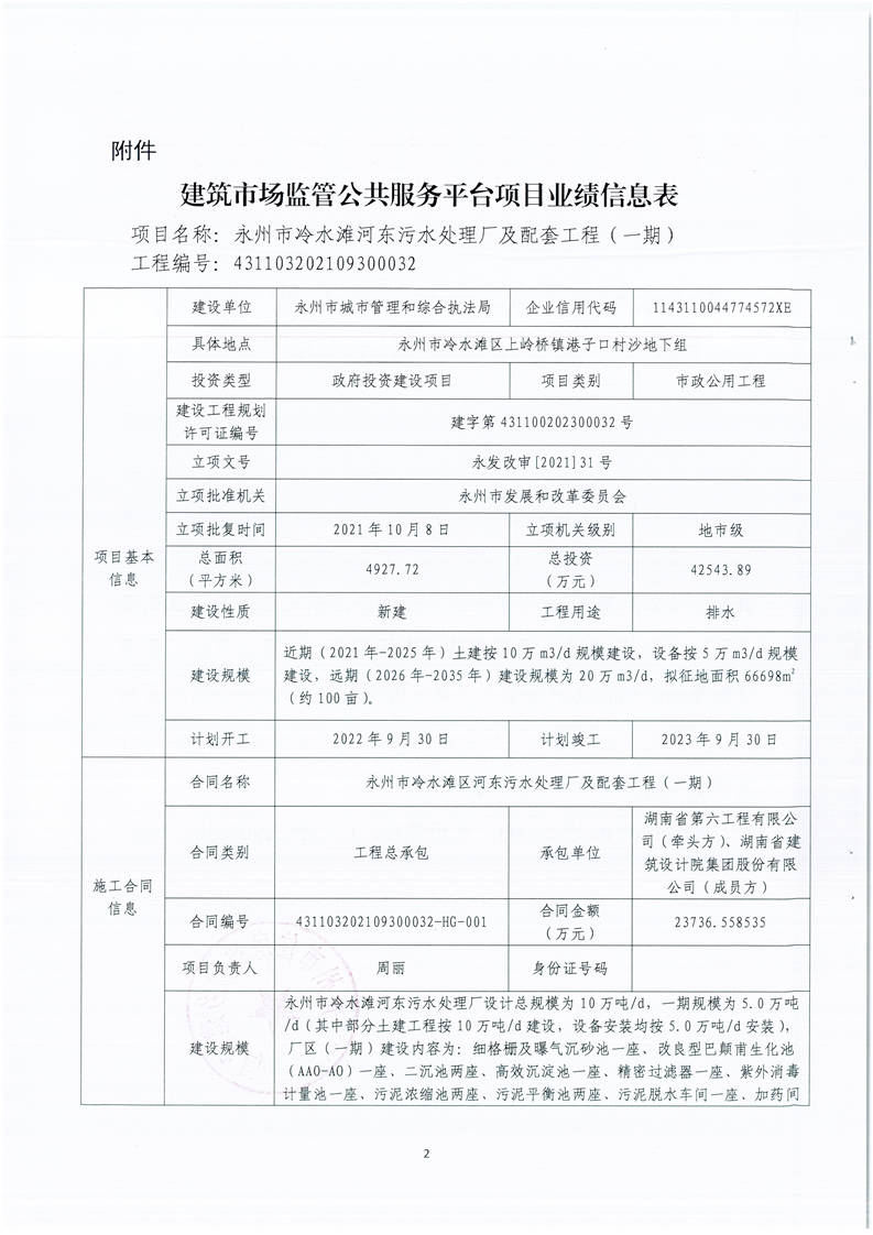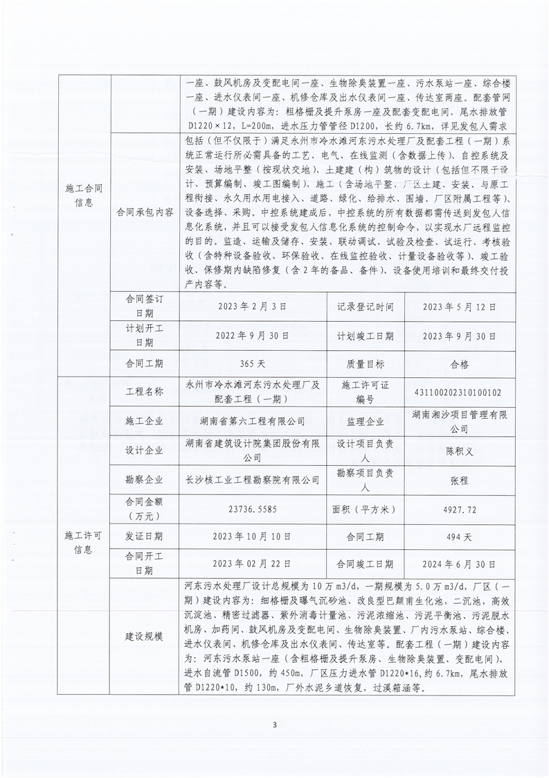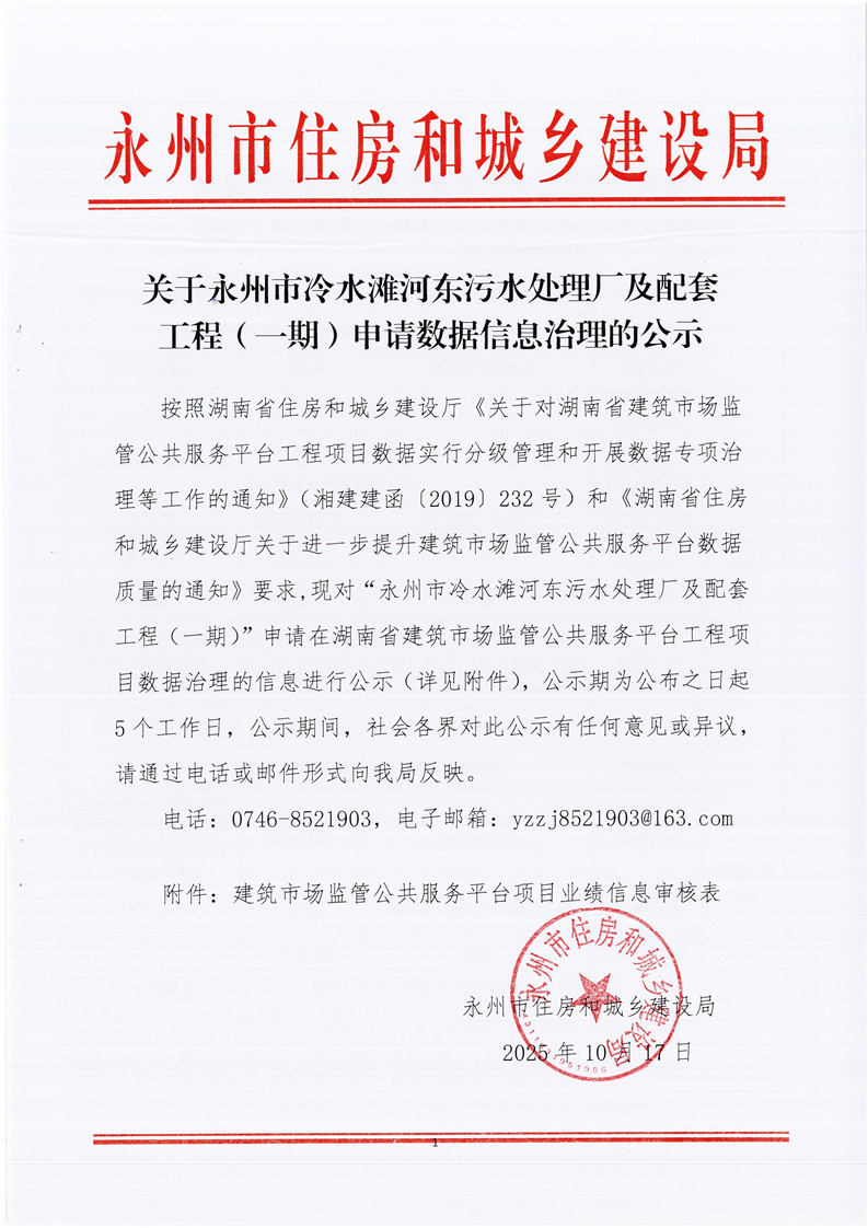 关于永州市冷水滩河东污水处理厂及配套工程(一期)申请数据信息治理的公示
