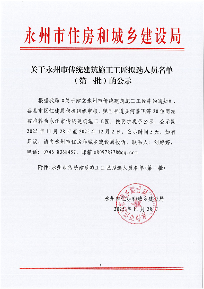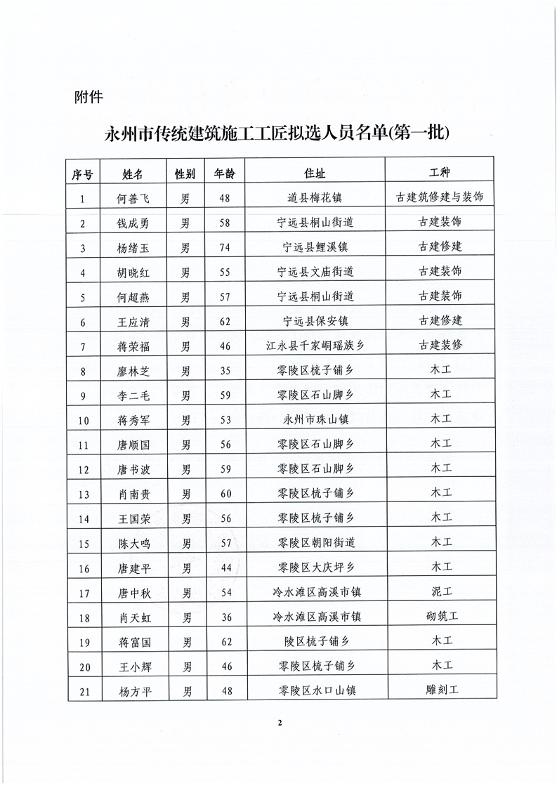 关于永州市传统建筑施工工匠拟选人员名单(第一批)的公示