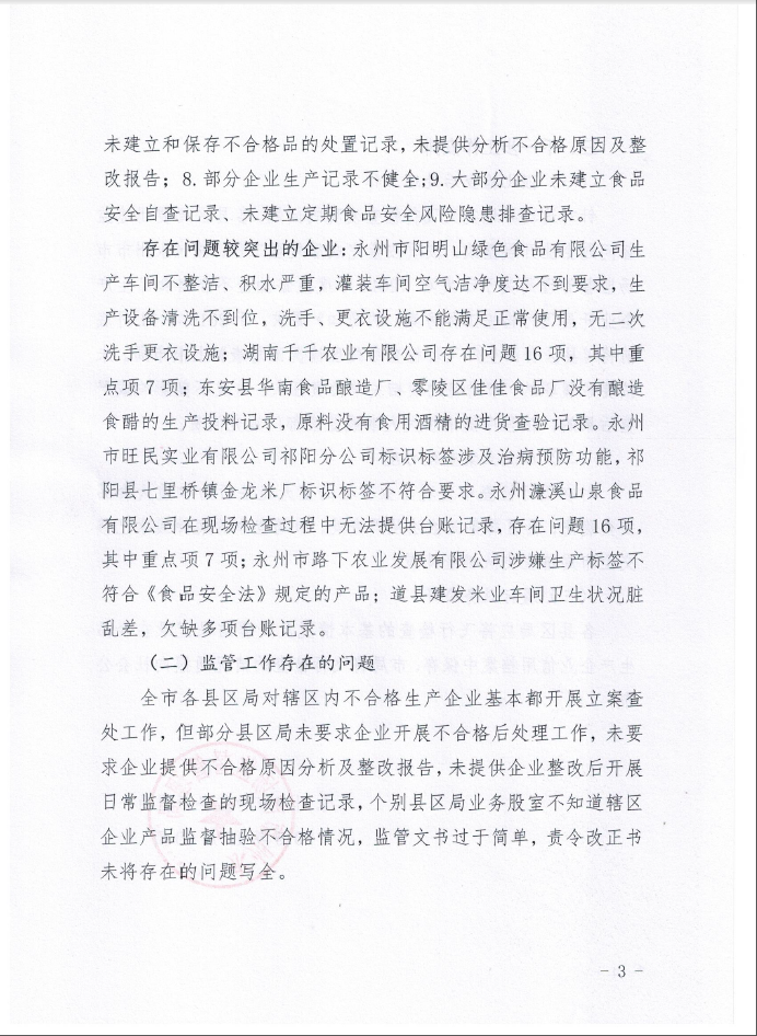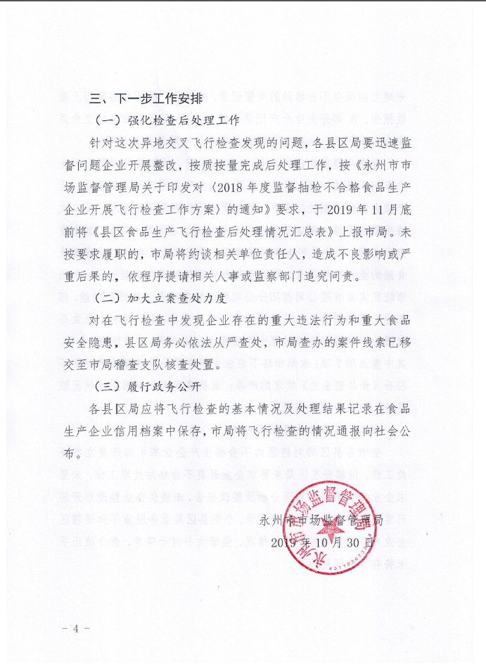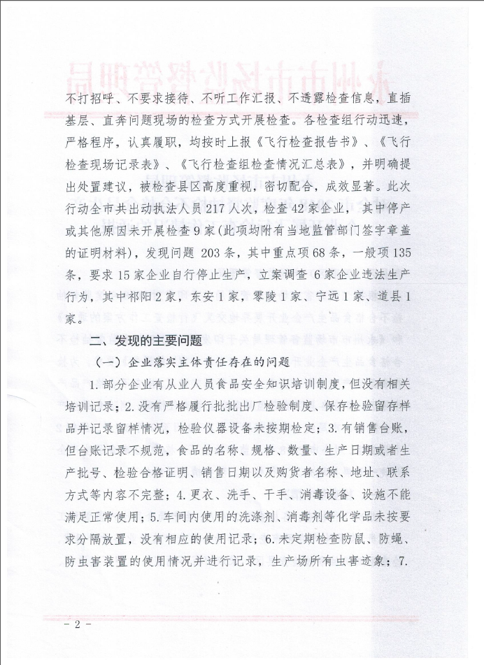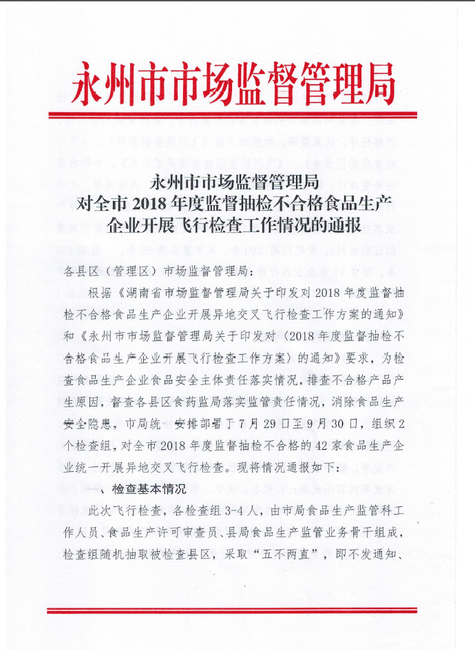 永州市市场监督管理局对全市2018年度监督抽检不合格食品生产企业开展飞行检查工作情况的通报