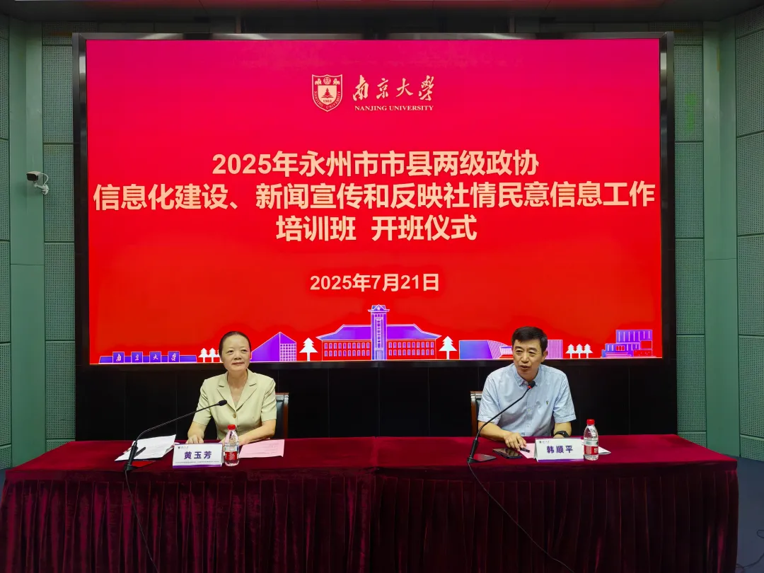 7月21日,2025年永州市市县两级政协信息化建设、新闻宣传和反映社情民意信息工作培训班开班仪式在南京大学举行。市政协党组副书记、副主席黄玉芳出席开班仪式并作动员讲话,南京大学全国干部教育培训基地办公室主任、终身教育学院院长韩顺平致欢迎辞。
