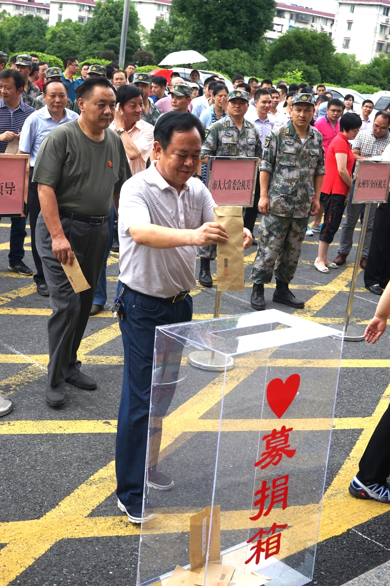 7月5日14时30分许,永州市委机关楼前排起了长队。市委书记、市人大常委会主任李晖,市委副书记、市长易佳良等市级领导依次走到捐款箱前,向受灾群众献上一份爱心。市政协机关全体党员在市政协党组书记、主席蒋善生的带领下纷纷慷慨解囊,现场气氛热烈感人。
